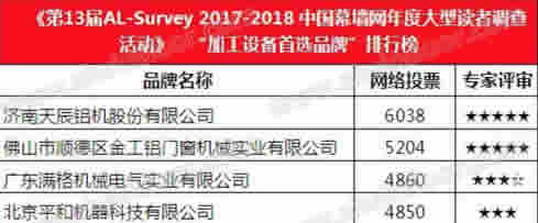 “天辰股份”憑借其雄厚的技術(shù)實(shí)力和品牌影響力,最終贏得廣大終端客戶、行業(yè)專家、設(shè)計(jì)院、顧問公司和媒體總編的高度認(rèn)可,在第13屆AL-Survey2017-2018中國(guó)門窗幕墻行業(yè)大型讀者調(diào)查暨“我最喜愛品牌”評(píng)選活動(dòng)中,成功衛(wèi)冕“加工設(shè)備首選品牌”大獎(jiǎng)!